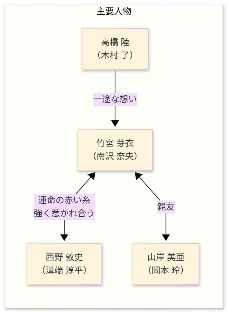 | 竹宮 芽衣 | 南沢 奈央 | 運命を信じる心優しい主人公。 |