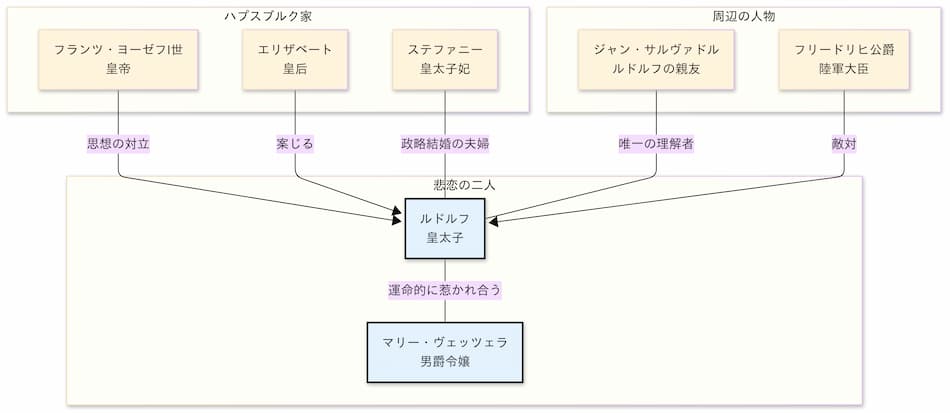 『うたかたの恋』の物語を深く理解するために、中心となる登場人物とそれぞれの関係性を紹介します。この人物たちの複雑な関係が、物語に奥行きを与えています。