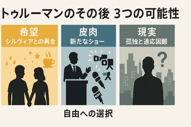 しかしどのシナリオにも共通するのは、トゥルーマンが手に入れた「自由」には、困難と責任が伴うという事実です。